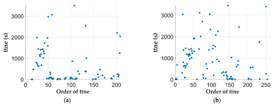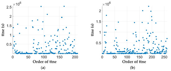The plots of Figure 12 show that ttne had several values that were very close to the x axis; they always were greater than 2 s, even if the scale of the y axis did not allow distinguishing 2 s from zero. This important characteristic, observed for all the sites of the system in this study, proved that the measured sags were characterized by two categories, i.e., sags grouped close to each other, i.e., clusters, and sags dispersed over time, i.e., rare sags. Similar evidence also was observed in [26] with voltage sags measured in other electric systems.
