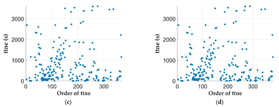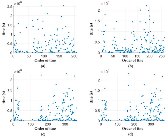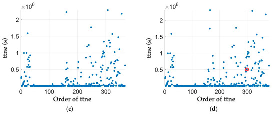 Since it was impossible to show the characteristics of the voltage sags measured at all of the sites of the system, we selected four sites as examples of those in which a sufficient number of voltage sags were measured. This criterium allowed better demonstrating the intermediate and final findings of the method. These sites, i.e., sites #20, #44, #74, and #75, are used as examples throughout the paper. Figure 12 shows the scatter plots of the ttne registered at the example sites from 2014 to 2016. For these four sites, since the values of ttne were plotted as functions of the variable order of ttne, which measured the order of the voltage sags that occurred in succession; for example, the ttne that corresponds to the order of ttne equal to 1 is the ttne between the second sag and the first sag; the ttne that corresponds to the order of ttne equal to 2 is the ttne between the third sag and the second sag, and so on. To help in reading the plots, the point (300, 0.5 × 106 s), highlighted with a red circle in Figure 12d), means that the time that elapsed between the 301st and the 300th voltage sag was 0.5 × 106 s (138.8 h, which is less than 6 days).