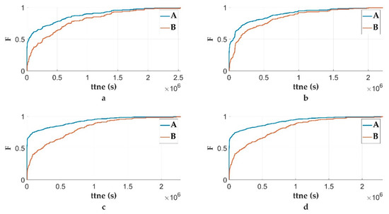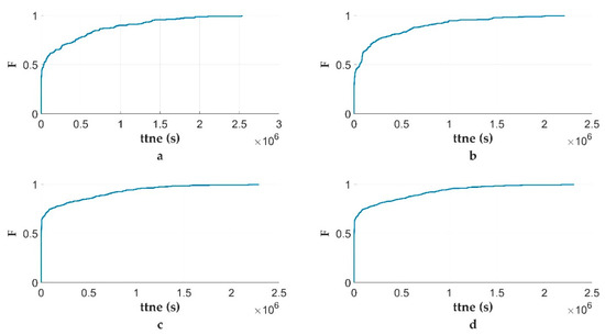 Figure 13 shows the cumulative distribution functions, F, of the ttne computed for voltage sags registered from 2014 to 2016 at the #20, #44, #74, #75 sites. For the same busbars, Table 4 provides the value of a specific example point that cannot be ascertained in the plots of Figure 13 for the time scale of the x axis. In particular, Table 4 shows the P50% percentile, i.e., the value of ttne such that the probability of having values equal to or less than ttne equals 50%.