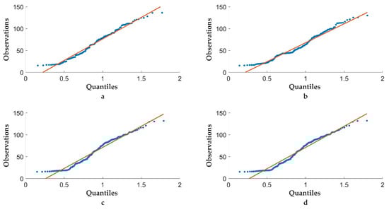 Exponential distribution Q-Q plots with cubic square transformation of the ttne measured in 2014, 2015, and 2016 at sites #20: (a), #44: (b), #74: (c), #75: (d), after the application of the 1h-filter.