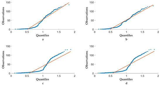 Exponential distribution Q-Q plot with cubic square transformation of the ttne measured in 2014, 2015, and 2016 at sites #20: (a), #44: (b), #74: (c), #75: (d), before the application of the 1h-filter.