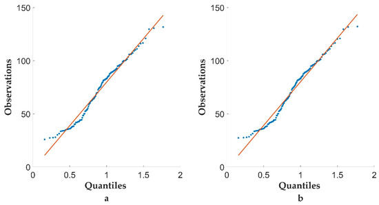 Exponential distribution Q-Q plot with cubic square transformation of the ttne measured in 2014, 2015, and 2016 at sites #74: (a), #75: (b) after the application of the filters (4.7 h for the site #74 and 5.3 h for the site #75).