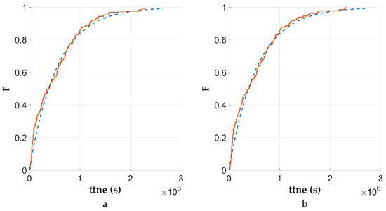 Cumulative distribution function, F, of the ttne measured in 2014, 2015, and 2016 at sites #74: (a), #75: (b) after the application of the of the filters (4.7 h for the site #74 and 5.3 h for the site #75) red curve, and cumulative distribution function with distribution parameter equal to estimated by relation (4) (blue curve).