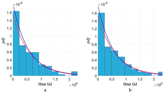 Probability density function fitted of the ttne measured in 2014, 2015, and 2016 at sites #74 (a), #75 (b), before the application of the of the filters (4.7 h for the site #74 and 5.3 h for the site #75)—red curve, and probability density function estimated by relation (1) with distribution parameter equal to estimated by relation (4)—blue curve.