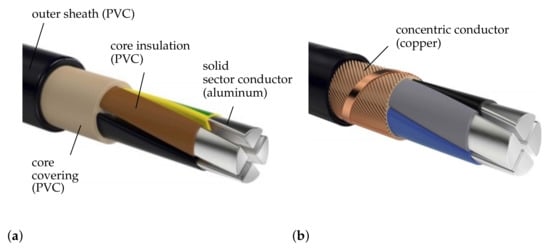 - Bayerische Kabelwerke AG (Bayka). BayEnergy® Starkstromkabel, PVC-/VPE-isoliert, konzentrischer Leiter, PVC-Mantel NAYCWY—3-adrig nach DIN VDE 0276 Teil 603. Available online: http://www.bayerische-kabelwerke.de/Produkte/Starkstromkabel/Aluminiumkabel_1_kV/?docId=cablespecies_101 (accessed on 5 May 2020).