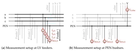 Figure 2a depicts the measurement scheme exemplarily for feeder 1. The three phase currents , , and and the PEN current of one single feeder are recorded at the same time. The direction of current flow is defined in direction of the substation.