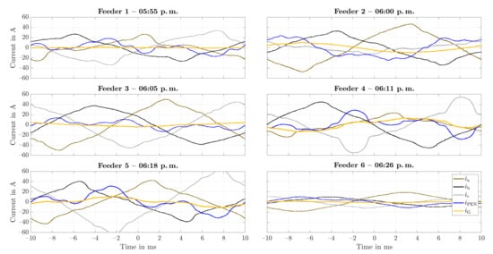 Figure 3 exemplarily shows measurements of currents of all six feeders of substation D over 20 ms. For all feeders, the three phase currents (brown), (black), and (grey) are significantly imbalanced; hence, the PEN conductor is carrying the return current (blue). The residual ground current (yellow) was calculated according to Equation (1), assuming the considered feeder to be the only one at the substation (also see Section 2.3).