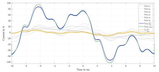 As seen earlier for feeder currents in Section 2.1, there is a relevant deviation between the neutral point current of the transformer and the sum of the feeders’ PEN currents. The overall sum of the currents in the PEN busbar has to add to zero. Hence, the residual current , yellow in Figure 4, results from Equation (2).