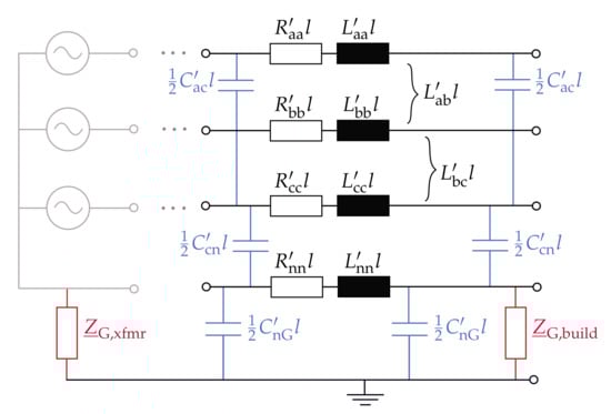 The modeling approach used in our work is, therefore, based on Olivier et al. [], and depicted in Figure 7. At the end of the line segment of length l, the neutral conductor is grounded with a grounding impedance , referring to grounding of an exemplary connected costumer building. As sketched in grey, reference ground is not defined to be the transformer’s neutral point, but we model the transformer’s neutral point to be grounded with an impedance .