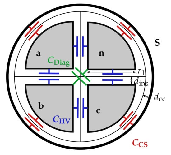 According to authors, like Oeding and Oswald [], Schwab [], and Kersting [], capacitances cannot be generally classified as negligible in low voltage cables due to small distances between conductors and the high permittivity of polyvinyl chloride (PVC).