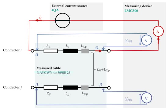 Authors, like Oeding et al. [], present tables for positive and zero sequence impedance parameters for different cable types, intended for rough calculations of minimum and maximum fault currents. Based on the assumption of equal mutual inductances between phases—which seems unrealistic for four-core cables (see Figure 1)—these parameters do not seem to be suitable for modeling of LV systems. Furthermore, the underlying assumptions regarding system grounding are derived from transmission grids [] and seem questionable for German LV grids.