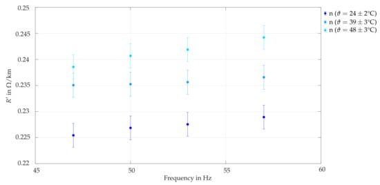 As low voltage cables are usually embedded about 1 below ground surface, daily temperature variations do not influence the temperature of the surrounding soil []. Nevertheless, heat losses of cables in operation lead to increased conductor and insulation temperatures. Depending on the load situation, temperatures inside the cable may reach the maximum rated temperature of 70 for PVC-insulated cables []. The electrical conductivity of the conductor shows a significant temperature dependency []. However, common modeling approaches assume conductor resistance to be constant during operation, relying on reference values valid for a temperature of 20 . In literature, there has been no discussion on the effect of this simplifying assumption on simulation accuracy.