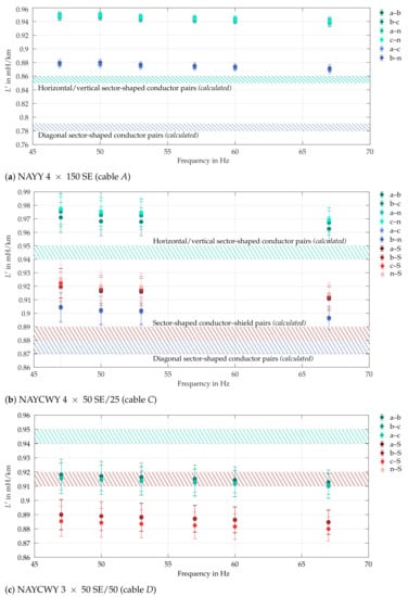 Our test objects are of different types of underground cables typically used in German LV grids and summarized in Table 5. Three of these show an asymmetric four-core design (A, B, C), one has a symmetric three-core design (D).