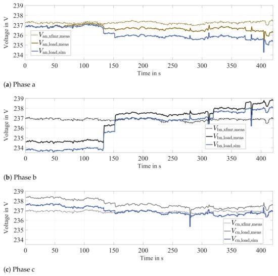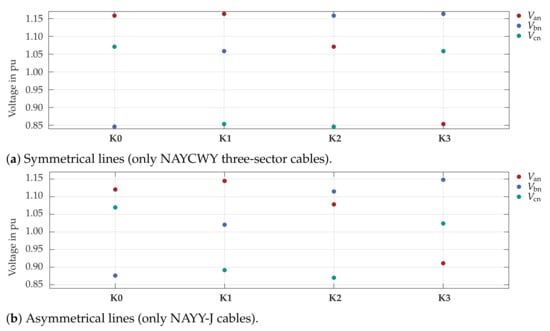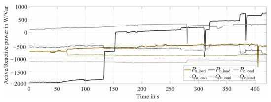 In the course of the ongoing German energy transition, the number of distributed photovoltaic (PV) systems installed in low voltage grids are rising. About 70% of those are small single- or two-phase rooftop systems []. Looking at this in more detail, the previously mentioned DSO’s assumption of symmetrical load conditions is not feasible anymore. Measurement results from Reference [] show that 93% of single-phase PV inverters are connected to the same phase, typically phase a. Increasing penetration rates of electric vehicles and battery storage systems—of which, once again, a large share has single-phase or two-phase grid connections—further amplify asymmetrical load situations [].