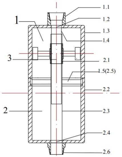 Structure and main components of the while-drilling energy harvesting device. 1.1—upper drill pipe joint, 1.2—through-hole, 1.3—upper shell, 1.4—upper well casing, 1.5—female screw, 2.1—fixing thread, 2.2—lower shell, 2.3—lower well casing, 2.4—through-hole, 2.5—male screw, 2.6—lower drill pipe joint.