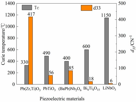 The energy harvesting procedure is realized by the piezoelectric materials in this work. As the drilling depth increase, the downhole working device usually encounters a high-temperature environment due to the influence of the geothermal gradient. When designing the energy harvest device for downhole equipment, it must be ensured that the piezoelectric element would not be depolarized by the impact of the high temperature. Therefore, the Curie temperature of the material should be more than twice the ambient temperature [30]. Curie temperature Tc and d33 values of several common high-temperature piezoelectric materials are shown in Figure 3. The piezoelectric material Pb(Zr,Ti)O3, known as PZT piezoelectric ceramics, owns good piezoelectric properties and a high dielectric constant, thus has been used extensively now. PbTiO3 is also a piezoelectric ceramics and is a promising high-temperature piezoelectric material with high piezoelectric properties and good anisotropy. However, PbTiO3 has manufacturing difficulties for microcracks appearance and polarization difficulty in its sintering process. (BaPb)Nb2O6 has a high hydrostatic piezoelectric performance and has been widely used in the field of ultrasonic nondestructive testing and medical diagnosis, but also has some disadvantages, such as low piezoelectric property, low electromechanical coupling coefficient and sintering difficulty. Bi4Ti4O3 has an interestingly layered structure and has strong spontaneous polarization, high resistivity, piezoelectric anisotropy and good temperature stability. However, Bi4Ti4O3 has low piezoelectric activity, and its manufacturing quality is difficult to guarantee. LiNbO3 combines high Curie temperature and large piezoelectric properties but is sensitive to heat and has poor thermal stability.