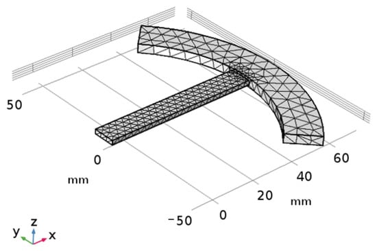 COMSOL Multiphysics numerical simulation software was employed to analyze the forced vibration. The meshing is divided through physical field control using COMSOL software. Conventional triangular meshing is used in the cantilever beam part, and the piezoelectric plate part is a grid with encryption meshes. The complete grid model contains 16,339 domain elements, 6796 boundary elements and 582 edge elements, as illustrated in Figure 4. As to the boundary conditions, the far end face of the cantilever beam and the part in contact with the piezoelectric plate are set as the fixed end. The initial velocity field and structural displacement field are set to be Zero. The piezoelectric material is set as the stress–charge type, and elastic matrix and coupling matrix are set as material library control. The multi-physical field adopts the built-in “piezoelectric effect” module in COMSOL, and the coupling interface is set as solid mechanics and electric field.