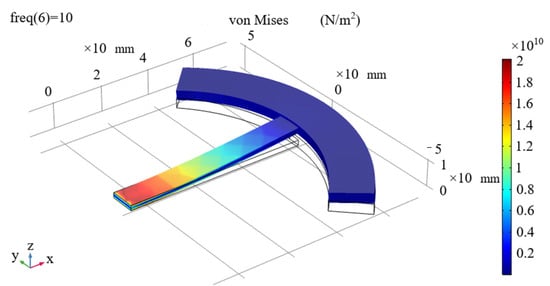 The stress nephogram of the cantilever beam under the harmonic disturbance of 10 Hz was obtained, as shown in Figure 5. It is obvious from Figure 5 that the stress in the radial direction presents an obvious division between the stress concentration area and the low-stress area. Moreover, a stress gradient transition zone exists between the two regions. According to the position of stress concentration area and transition area, the strain gauge should adhere to the side close to the inner ring. Moreover, the coverage range should be between 0 and 26 mm. In this paper, a strain gauge length of 24 mm was selected for subsequent calculation and analysis. Figure 4 shows that there is an area of the low-stress zone near the fixed end. In order to avoid adhesion in this area, the strain gauge adheres to an area 2 mm away from the inner ring. Because of the limited size, the strain gauge area should be increased as much as possible after the length design is completed. Thus, the strain gauge width is set to be the same as that of the cantilever beam. Design parameters of the piezoelectric cantilever beam are shown in Table 3.