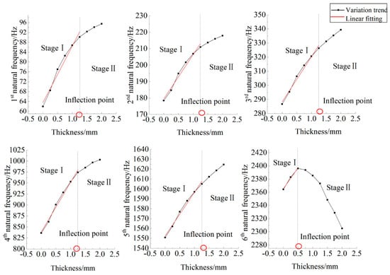 Rapid growth stage. In the initial stage, there is a positive correlation between the natural frequency of the piezoelectric cantilever and piezoelectric thickness. The natural frequency of the piezoelectric cantilever increases rapidly with the increase of the piezoelectric thickness until the thickness reaches an inflection point (which is marked with a red circle in Figure 6). The inflection points for the natural frequencies in Figure 6 differ. To be specific, the inflection points are 1.25, 1.25, 1.25, 1.25, 1.25 and 0.5, respectively.