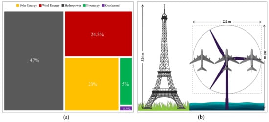 Figure 1. (a). Distribution of global renewable energy (2019). (b). Size comparison of the largest wind turbine (SG 14–222 DD) with Boeing Airbus A380 and the Eiffel tower.