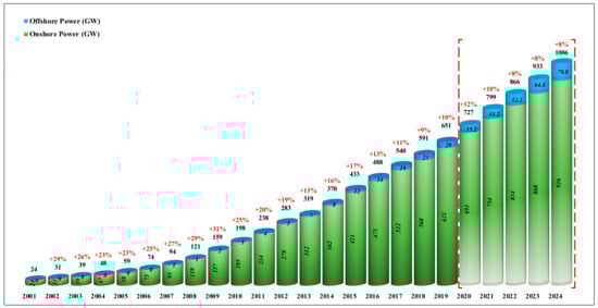 The last few decades were marked with a sharp depletion in global fossil-fuel reserves and a rise in environmental concerns. Consequently, the focus shifted toward eco-friendly and renewable sources for global energy security. The development and optimization of renewable energy sources, i.e., hydro, solar, wind, bioenergy, geothermal, etc., hold the key to achieving sustainable power production. According to the International Renewable Energy Agency (IRENA), the Global Renewable Energy (GRE) capacity at the end of 2019 amounted to 2537 GW, which is equivalent to 34.7% of the Net Global Energy (NGE) capacity [1], and this represents a growth of 7.4% (176 GW) from 2018, in which 2.5% was contributed by wind energy [1]. The share of various renewable energy sources in the GRE capacity is presented in Figure 1a, whereas the steady contribution of wind energy over the last decades is depicted in Figure 2. Accordingly, at the end of 2019, the Global Wind Energy Council (GWEC) reported an increase of 10% in the Global Wind Energy (GWE) capacity, which could be expected to maintain an average growth of 9.2% over the next five years [2]. Such a forecast in the growth of wind energy has been seen to be corresponded by the demand for larger turbines. The modern multi-MW wind turbines feature diametric size of more than 200 m with the projected power generation of up to 15 MW [3]. Some of the world’s most powerful wind turbines include General Electric’s Haliade-X (12–14 MW), Siemen Gamesa’s SG 14–222 DD (14–15 MW), etc. Figure 1b illustrates a comparison of the size of Boeing’s Airbus 380 and the Eiffel Tower with a state-of-the-art offshore wind turbine (SG 14–222 DD), exhibiting a rotor diameter of 222 m with a rated capacity of 14 MW, scheduled to be commissioned in 2024 by Siemens Gamesa [3].