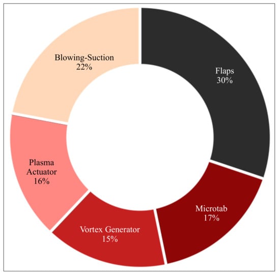 This article presents a state-of-the-art review of various flow-control devices used for wind turbine performance enhancement, such as flaps (rigid, flexible/ATEG,, and gurney), microtabs (tabs and trailing-edge effectors and MiTE), vortex generators (passive, smart, and micro vortex generators), plasma actuators, and blowing-suction mechanisms (steady and pulsed-blowing/suction, circulation control, and vortex generator jets). A summary of the share of the reviewed flow-control devices in the presented literature is given in Figure 3. The review presents a comprehensive and up-to-date progress in each flow-control device, along with detailed discussions of the associated prospects and challenges toward wind turbine applications.