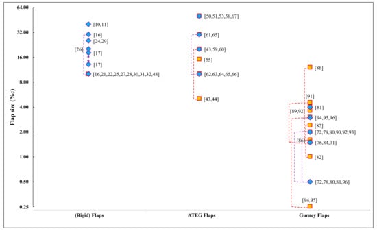 Figure 5. Literature survey of rigid, adaptive (ATEG), and gurney flaps. (The empty and filled markers correspond to the numerical and experimental investigations, respectively. The arrows indicate the range of investigation.).