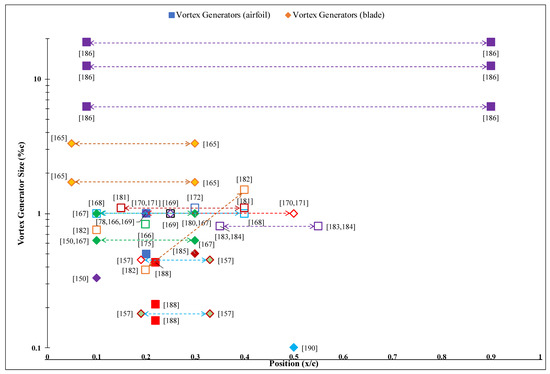 Vortex generators (VG) are usually triangular or rectangular small vanes mounted on the suction-surface incident to the incoming flow. By carrying momentum from the free stream into the inner-flow zone, VGs generate trailing vortices that essentially modify fluid-movement and reenergize the boundary layer, which delay flow separation and enhance the overall lift coefficient [145]. Separation of the boundary layer occurs when the section nearest the wall or leading-edge witnesses flow reversal. Under stall conditions, the separation point is characterized by null/negligible shear stress. The vortices produced by VGs were experimentally observed to possess helical symmetry [146]. VGs are installed as co-rotating and counterrotating arrays to exploit their natural alignment by promoting fluid-entrainment into the boundary layer from the free stream and profile-surface, respectively. An array of VG is illustrated in Figure 4. The counterrotating VGs are more efficient as they advect comparatively higher-momentum fluid into the boundary layer, thereby strengthening the surface flow and making it more resistant to the adverse pressure gradient [147]. Figure 8 displays a plot of the literature survey of vortex generators as a function of size (%c) and position (x/c), relative to the chord.