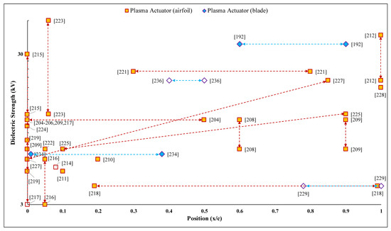 Plasma actuators consist of two electrodes, anode and cathode, wired at large voltage-difference to generate electric field and induce “plasma-wind” near the surface, as shown in Figure 6. The “wind” is generated by the impact forces in the electrode gap area of collisive plasma ions and neutral particles (air) [191]. Accordingly, the induced wind acts as a body force and pushes the surrounding fluid, thereby generating the zero-net mass flux (ZNMF) jet, which modifies the airflow profile on the boundary layer and postpone the separation. The plasma-induced jet adds momentum to the boundary layer, and thus, it results in flow instabilities that alter the boundary-layer properties [85,192,193,194]. The actuator’s performance depends on geometrical (electrode shape and thickness, distance gaps, etc.) and electrical parameters (voltage, shape of wave and frequency while AC, etc.), ambient air characteristics (temperature, heat, humidity, wind velocity, etc.), and the dielectric surface design [191,195,196,197]. Plasma actuators are designed with various configurations, some of the primary ones include devices with DC surface corona discharge, AC surface dielectric barrier discharge, sliding discharge, and wall jet [85,191,193,198]. Figure 9 shows a plot of the literature survey of plasma actuators with the dielectric strength (kV) as a function of the chordwise position (x/c).