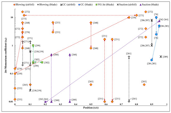 Figure 10. Literature survey of blowing-suction control. (The empty and filled markers correspond to the numerical and experimental investigations, respectively. The arrows correspond to the range of investigation.).