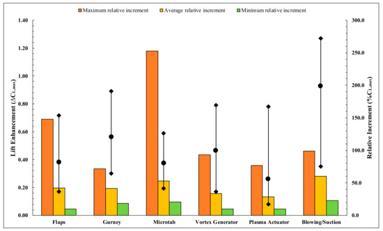 Figure 11. A comparative plot indicating maximum, average, and minimum lift enhancements (∆CLmax) and relative lift increments (%CLmax) achieved by different flow-control devices.