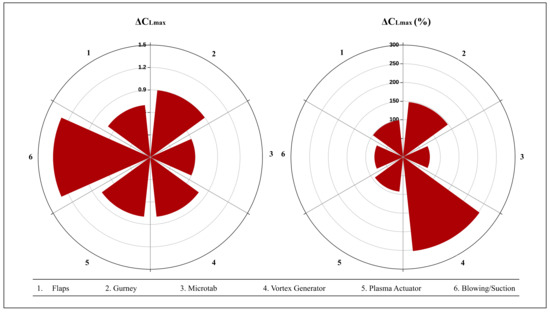 Figure 13. Maximum lift-enhancement ΔCLmax and relative enhancement %CLmax of the reviewed flow-control devices.