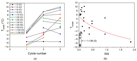 | WS | Content of O Sand (Mass%) | ΔHice cryst (J/g) 1 | ΔHice melt (J/g) 1 | Thyd onset (°C) | ΔHhyd form (J/g) 1 | Teq (°C) | ΔHhyd dec (J/g) 1 |