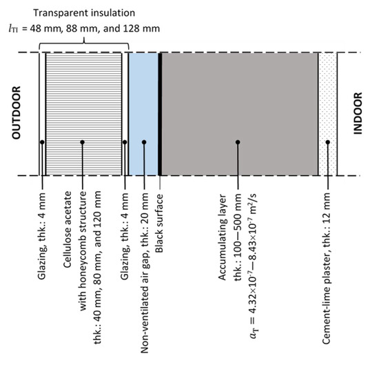 Thermal properties of the material of which the accumulation layer is made and its thickness are the basic parameters influencing the efficiency of SWs [5,23]. In order for the material to store heat effectively, it must have a high density, high thermal capacity, a significant thermal conductivity value, and an appropriate thickness so that the heat can penetrate the whole layer of material during the absorption of solar radiation and reach the interior of the heated room [8]. The depth, at which a daily temperature wave reaches the accumulation material during a given period of time, depends on the value of thermal diffusivity of the material—i.e., on the transport coefficient controlling the non-stationary heat flow. Materials with higher thermal diffusivity values are usually more effective in storing heat at greater depths than those with lower thermal diffusivity values. On the other hand, if the AL is too thin, the time shift of the extreme temperature is short, and the heat will reach the room in the early afternoon, when, at the same time, there are large direct gains through the glazed surfaces. On the other hand, if the AL is too thick, then we can expect a significant reduction in solar gains flowing into the building in the case of an unventilated Trombe wall [24].