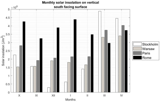 Monthly solar insolation on a vertical south facing flat surface during the heating period (calculated on the basis of data from [44]).