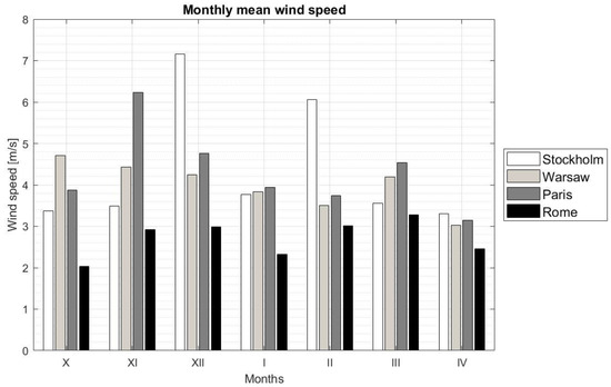 According to Köppen’s classification, the climate in Stockholm and Warsaw is of the Dfb type, i.e., the continental climate with warm and wet summers and moderately cold winters. However, due to the fact that Stockholm is further north, temperatures in Stockholm are lower than in Warsaw. The climate in Paris belongs to the category of Cfb, which is a temperate oceanic climate with mild winters and warm, humid summers, while in Rome, we are dealing with the Csa-type climate, that is, a temperate Mediterranean climate, with mild winters and hot and dry summers. Figure 2, Figure 3 and Figure 4 show a comparison of the monthly mean outdoor temperature, monthly insolation of the south-oriented vertical plane, and the monthly mean speed of wind in the individual months of heating period (from October to April) for all analyzed cities respectively.