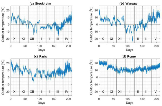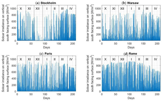 The meteorological data necessary to carry out computer simulations have been downloaded for each of the locations under consideration from the European Commission’s Photovoltaic Geographical Information System [44]. These data are a set of hourly parameters, characteristic for the climate of a given place and are called a typical meteorological year. The values used in the presented work are a sequence of hourly values: outside temperature, solar irradiance falling on a vertical plane oriented to the south, and speed of wind, for the whole heating period and for two months preceding the heating period (data for August and September were used to determine the initial temperature distributions in the walls at the beginning of October). Diagrams of this data are shown illustratively in Figure 5 and Figure 6 for the temperature and solar irradiance courses respectively. It is worth noting at this point that a length of the heating season is usually different for the individual locations: Stockholm—from mid-September to mid-May [46]; Warsaw—from September to May; Paris—from October to April [47]; Rome—from November to mid-April [48]. However, in order to unify the calculations and increase the comparability of the results, the same average length of the heating season—i.e., from October to April—was adopted in this work for all the analyzed cities.