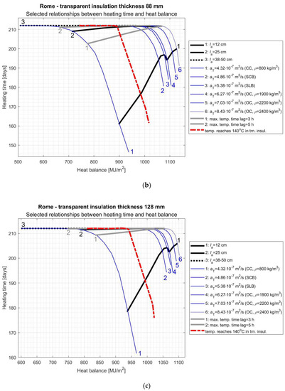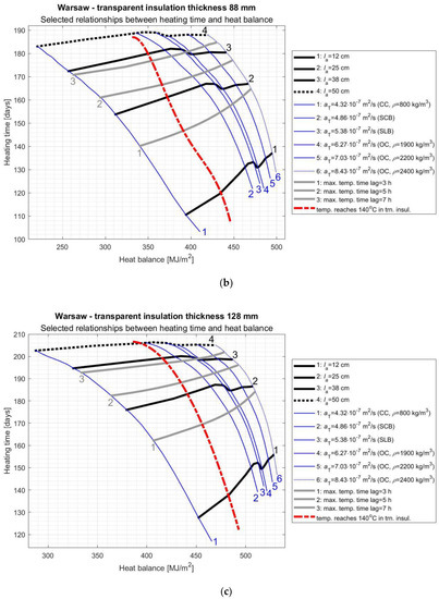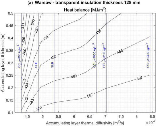 On the basis of the diagrams shown in Figure A1a, Figure A2a, Figure A3a, Figure A4a, Figure A5a, Figure A6a, Figure A7a, Figure A8a, Figure A9a, Figure A10a, Figure A11a and Figure A12a we can state that the SWs heat balance obtained during the heating season increases with the increase of thermal diffusivity of the AL and decreases with the increase of this layer thickness. Similar conclusions were reached by the authors of the work [24], in which it was stated that in the case of an unventilated Trombe wall, the heat gains decrease with the increase in wall thickness. In turn, [26] shows that the increase in thermal diffusivity of the AL reduces the primary energy demand of a building with a glazed Trombe wall, which is tantamount to an improvement in the seasonal heat balance of such a wall. Different conclusions were reached by the authors of the article [27] who stated that the heat demand for heating of a building with a Trombe wall decreases with the decrease of AL thermal diffusivity (less demand was obtained using SCB than concrete, and the lowest demand was obtained for the AL made of CC). The obtained results were explained by the fact that the effect of limiting heat loss by a material with lower density (and lower thermal conductivity coefficient) outweighs the effect of reducing solar heat gains due to higher thermal resistance. The different conclusions presented in [27] may result from the specificity of the climate in which the analyzed building was located (Ancona according to Köppen’s classification belongs to the climate category Cfa—humid subtropical climate), and they cannot be uncritically extended to SWs located in regions with different meteorological data. Both in the study [26,27], it was found that increasing the thickness of the AL improves the energy efficiency of Trombe walls (the primary energy demand and the heat demand for heating the building were reduced respectively), which was explained by the increase in the thermal resistance of the system. Since both of these articles analyzed the traditional Trombe glazed walls, this conclusion shows the different behavior of SWs equipped with a glass pane or TI.