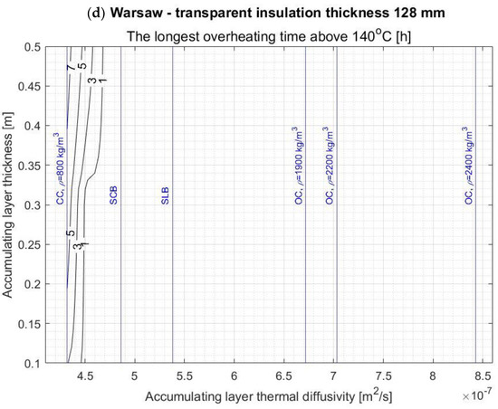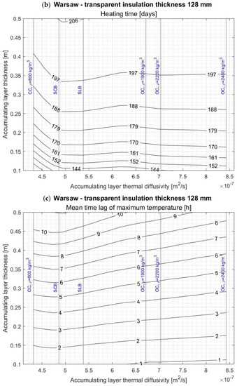 The obtained results allowed the authors of the work to make contour graphs showing the dependence of the seasonal heat balance of the SW on the AL thickness and its thermal diffusivity for each considered TI thickness and SW’s location. Analogous contour graphs were made for the heating time, the longest overheating time above 140 °C in the TI, and the time of the maximum temperature time lag. Examples of such diagrams concerning the SW with 128 mm thick TI and located in Warsaw are shown in Figure 7. In addition, the graphs show the vertical lines corresponding to the thermal diffusivity of typical construction materials with the aforementioned parameters. The diagrams, relating to the cases of TI with other thickness values and locations can be found in Appendix A.