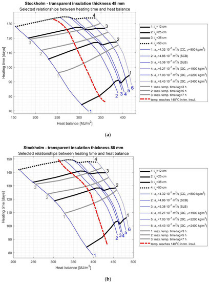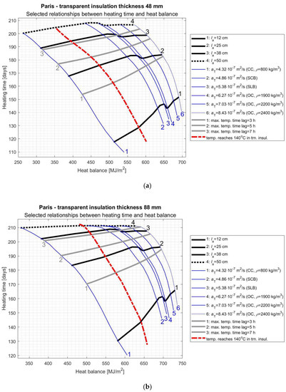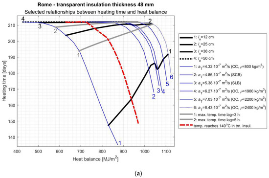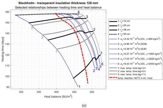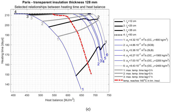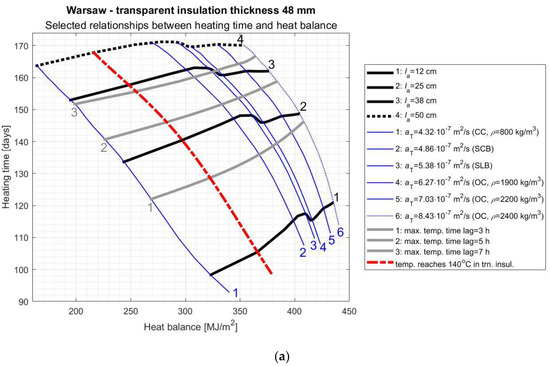 As it results from the above considerations, the proper selection of AL parameters and TI thickness is a complicated task and depends to a large extent on the specific climate in which the SW will be used. In order to facilitate this process, the authors of this study prepared graphs (Figure 8, Figure 9, Figure 10 and Figure 11) of the variability of the room heating time in function of the SW’s heat balance depending on the selected most important AL features. On these nomograms, the thick black lines correspond to different AL thickness values ( = 12, 25, 38, and 50 cm), the thin blue lines correspond to the individual materials specified in Section 3, the grey thick lines correspond to different maximum temperature time lags (3, 5, and 7 h), while on the left side of the red dashed line there are solutions that are not acceptable due to overheating the TI.
