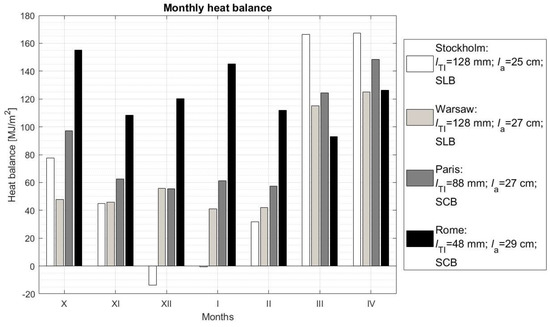 In the paper [45], the Winter Climatic Severity Index (WCSI) and Summer Climatic Severity Index (SCSI) were introduced to describe the nuisances of a given climate, respectively in winter and summer. Depending on the WSCI values, the authors have singled out five different climate zones marked with the letters A, B, C, D, and E, with each successive climate characterized by a more severe winter. The SSCI values were used by the researchers to distinguish four climate zones 1, 2, 3, and 4, with different summer nuisance, whereby the higher the number the zone has, the hotter the summer in the zone. The values of the discussed indicators in the case of the individual cities analyzed in this work are respectively: Stockholm—WSCI = 2.91, SCSI = 0.01; Warsaw—WSCI = 2.38, SCSI = 0.26; Paris—WSCI = 1.39, SCSI = 0.31; Rome—WSCI = 0.51, SCSI = 1.37. This allows the above locations to be classified by the zones: Stockholm, Warsaw—E1, Paris—D1, Rome—on the border of zones B3 and C4.