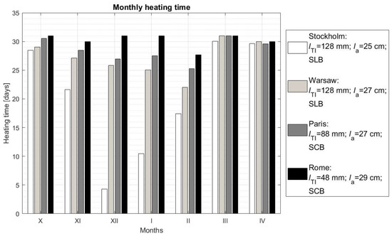As shown in Figure 12, the SWs with proper AL parameters and TI thickness show a positive heat balance in almost all months of the heating period regardless of their location. The only exception to this is the wall located in Stockholm during December and January. However, regardless of the fact that the heat balance of the SW operating in Stockholm during these months is negative, there are also periods when it constitutes a heat source in the room as shown in Figure 13 (in December the total heating time is about 4 days, and in January—over 10 days). Figure 13 also shows that the SW located in Rome will heat up the room for practically the entire heating season (211 days out of 212 days of the heating season). In the case of this wall, in the seasonal climate transition periods, it may be advisable to temporarily lower the TI rolling shutters due to excessive heat gains, especially on days with high insolation in October and April. Also for the SW located in Paris, the time during which it acts as a heat source is quite long (93% of the heating period), but the heat gains obtained by this wall are usually much lower than in the case of the SW located in Rome. The heating time of the SW located in Warsaw is comparable to the heating time of the SW operating in Paris (89% of the heating season); however, heat gains obtained by this wall are about 22% lower than in the case of the SW in Paris. The SW located in Stockholm has the shortest heating time (64% of the heating period), but its heat balance is slightly higher than that of the SW in Warsaw. It can be concluded that SWs in buildings located in the north of Europe will perform their function well, especially during the seasonal climate transition periods (autumn, spring). SWs with TI located in the central regions of Europe will also heat rooms in winter, but their heat gains will not be too high. In contrast, SWs located in southern Europe can perform their function for the entire heating period.