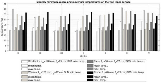 Based on Figure 14, it can be concluded that the mean monthly temperature of the internal surface of the SWs in all locations does not usually exceed 26 °C. The months: March (28 °C) and April (28.3 °C) in Stockholm; April (26.2 °C) in Warsaw; April (27.6 °C) in Paris; and October (27.5 °C), January (27 °C), and April (26.2 °C) in Rome are here the exceptions. Since the approximate perceived temperature can be calculated as the arithmetic mean of the air temperature in the room (20 °C) and the radiant temperature of wall, it can be concluded that in the vicinity of the designed SW, the thermal conditions will be close to the conditions of thermal comfort which range from 20 °C to 25 °C in the heating period, while it ranges from 23 °C to 26 °C in summer [53]. Although the temperature on the internal surface of the walls may temporarily increase in the analyzed cases up to 41.3 °C (the SW located in Stockholm in March), it is still the one not exceeding the temperature range acceptable for use in water wall radiators (from 35 °C to 45 °C).