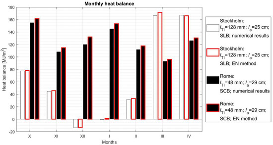 Comparison of monthly heat balances of the SWs located in Stockholm and Rome, calculated numerically and using the standard method according to [31] in the case of locations in Stockholm and Rome.