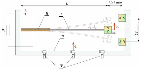 The subject of research is system for energy harvesting from vibrating mechanical systems, based on a flexible beam I (Figure 1). Its mechanical features were reflected by the stiffness cB and the viscous damper bB. These parameters were identified on the basis of geometric dimensions: length L = 101 mm, width d = 15 mm and thickness h = 0.27 mm and elastic properties of the material given by Young modulus E = 2.1 × 1011 Pa. In addition, we assume a priori their linear mechanical characteristics and any nonlinearities occurring in the examined systems are caused by interactions occurring between permanent magnets. Additionally, the dissipative element takes into account energy losses due to deformation and friction at the point of attachment to the rigid non-deformable frame III.