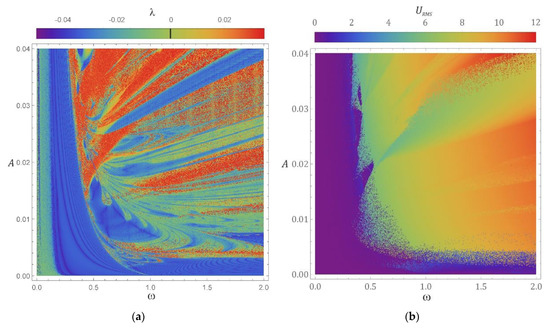 Taking into account the quantitative and qualitative evaluation of the influence of the parameters characterizing the external excitation affecting the energy harvesting system, a multi-coloured map of the effective value of the voltage induced on the electrodes of the piezoelectric transducer was drawn (Figure 2b). On the basis of computer simulations it can be clearly shown that the TEH system with permanent magnets is characterized by low efficiency of harvesting energy URMS < 2 V, in the range of low values of the dimensionless frequency ω < 0.4. A similar conclusion can be drawn for the excitation amplitude A < 0.004 m. Larger values of the dimensionless excitation frequency ω and the amplitude of the harmonic excitation A cause an increase in the voltage induced on the piezoelectric electrodes. This property confirms that such a system may be an effective source of harvesting energy in vibrating mechanical systems characterized by high displacement values. It is also worth noting that there is no correlation between the multi-colour maps of the distribution of the largest Lyapunov exponent (Figure 2a) and the energy harvesting effectivity (Figure 2b).