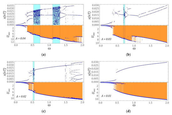 The imaging of the results of model studies in this way allows for a preliminary estimation of the ranges of variability of the dimensionless excitation frequency ω, in which we deal with coexisting solutions. We note here that we are only talking about a preliminary estimation, because the effective value of the voltage induced on the piezoelectric is calculated on the basis of the initial conditions defined once. Nevertheless, the use of such an approach to qualitative analysis of the dynamical system provides satisfactory results. Exemplary results of numerical experiments, performed with respect to four values of parameter A, are graphically depicted in graphs (Figure 3). The dark blue points in the diagrams of the diagram of RMS voltage values induced on the piezoelectric electrodes (bottom graphs shaded in orange) can be interpreted as an indicator of the effectivity of energy harvesting for coexisting solutions.