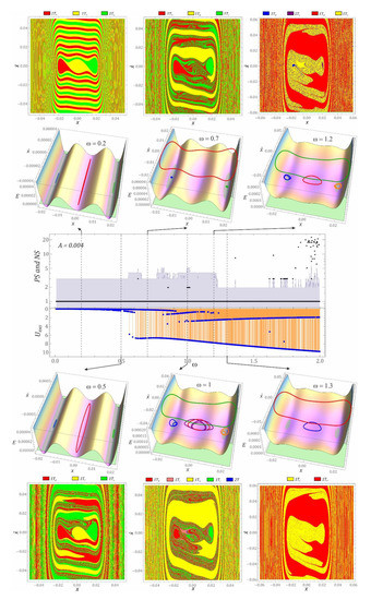 In the next part, detailed model studies of coexisting solutions were carried out in relation to the amplitude of the source of mechanical vibrations A = 0.004 m. This value was picked to represent different kinds of transport means but especially cranes [35]. The results of the computer simulations were visualized in the form of three-dimensional phase trajectories against the background of the potential surface and attraction pools. For this purpose, a numerical procedure was developed in the Mathematica software, through which it is possible to estimate the number and periodicity of coexisting solutions (diagram of solutions—DS). The results of numerical calculations were visualized in the form of a graph with the following diagrams: periodic solutions (PS, blue points) and number of solutions (NS, blue shaded graph). The procedure for drawing PS and NS diagrams is based on the fixed points of the Poincaré section. It should be noted that these diagrams are used for the initial assessment of the nature of coexisting solutions, because their accuracy is a compromise between the precision of numerical calculations and the duration of the computer simulation. For this reason, tests with increased precision are carried out in relation to specific values of the parameter ω.