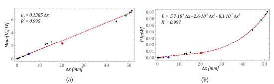 The graph (Figure 5a) illustrates the causal relations between the beam displacement u and the voltage UP induced on the electrodes of the piezoelectric transducer. Based on the identified approximation curve, it was found that there is a strong linear relationship between the analysed physical quantities, as evidenced by the R2 coefficient being approximately one. In the case of the relationship between the displacement x and the average electrical power harvested on the resistive element, there is a non-linear relationship. The best fit of the data was obtained, approximating them with a third-degree polynomial function (Figure 5b). The mathematical relationships presented in the diagrams (Figure 5) allow an initial estimation of electric energy, only based on the observation of the beam displacement.