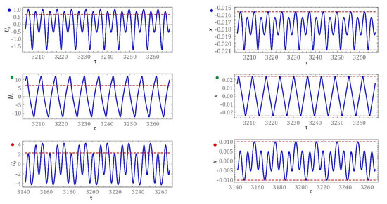 Voltage output and displacement time series related to selected solutions (from Figure 5) marked by the corresponding coloured points (blue, green, and red). The red dashed lines denote RMS of the output voltage, mean (Up) expressed in [V]—on the left hand side, and the peak values of displacement, xmin and xmax (Δx = xmax − xmin) expressed in [m]—on the right hand side. These quantities are used in Figure 5.